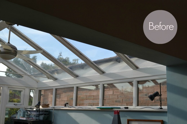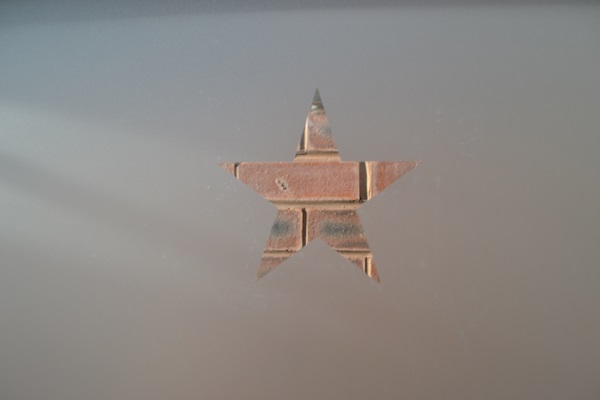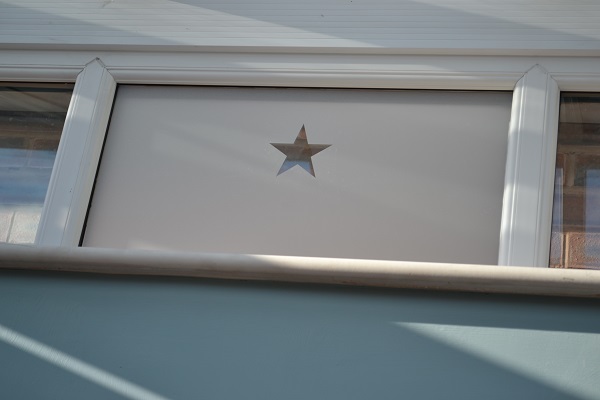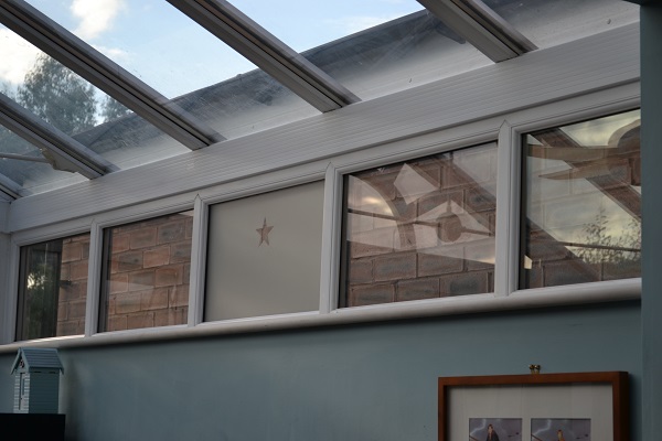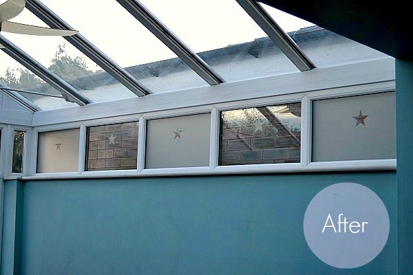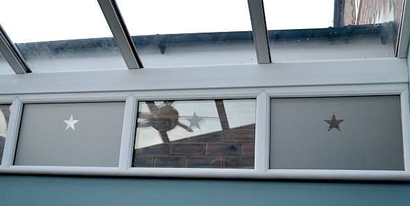 Last time, on this subject of frosted window film, I teased you with a little reveal of the star on our conservatory’s middle window, so here are a couple more shots, after I peeled off the cut-out.