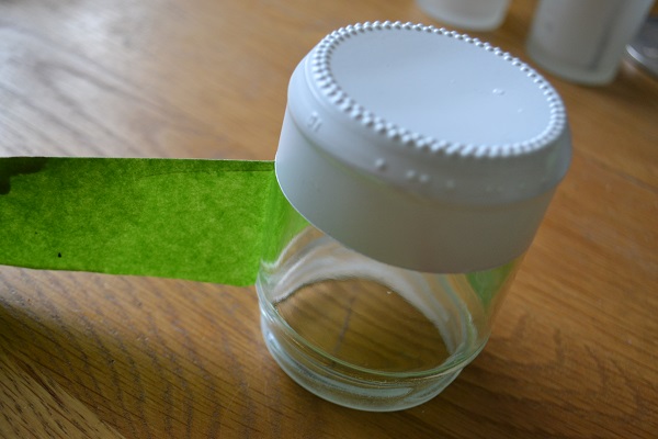 With the smaller jam jar, I wrapped some frog tape (masking tape) near the base and sprayed on some white paint I had left over from another project for a ‘paint dipped’ effect, which is fashionable right now – you see it on woven baskets, wooden utensils, chair legs etc.