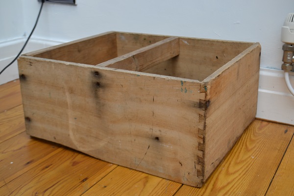 I’m not sure what you would call this old thing; I think it’s a trug and it used to live inside our Victorian ‘coffee table’ chest, but eventually ended up in the garden shed with some bits and bobs in it. So when we had a much needed ‘shed cull’ recently, it became redundant and I wondered what to do with it. Since I had bought some flowers and hadn’t planted them out, I thought it might look nice painted with our house number and popped outside the front door as a container for the blooms.