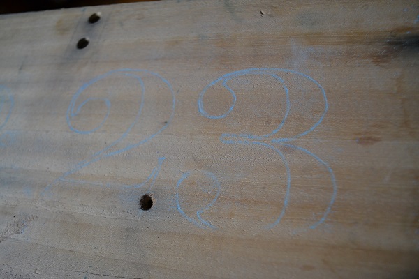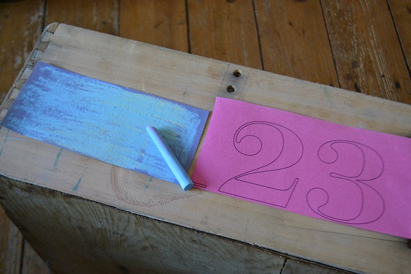 Then simply put the chalky side against the wood and with a pencil, trace the outline of the numbers. When you remove the paper, you should have template of the numbers, pressed onto the wood in chalk as a paint guide, like this: