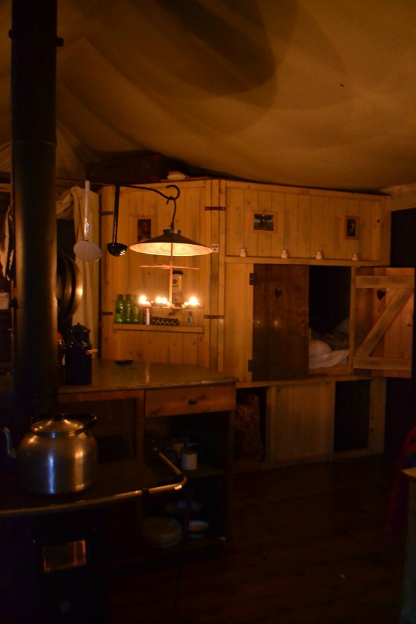 That first candlelit evening in the tent was quite magical. No distractions such as TV or computer games. The boys drew pictures at the big wooden table and eventually snuggled up together in the cupboard bed, listening to David Walliams narrate one of his stories. It was lovely to hear their giggles – a rare evening of peace and harmony!